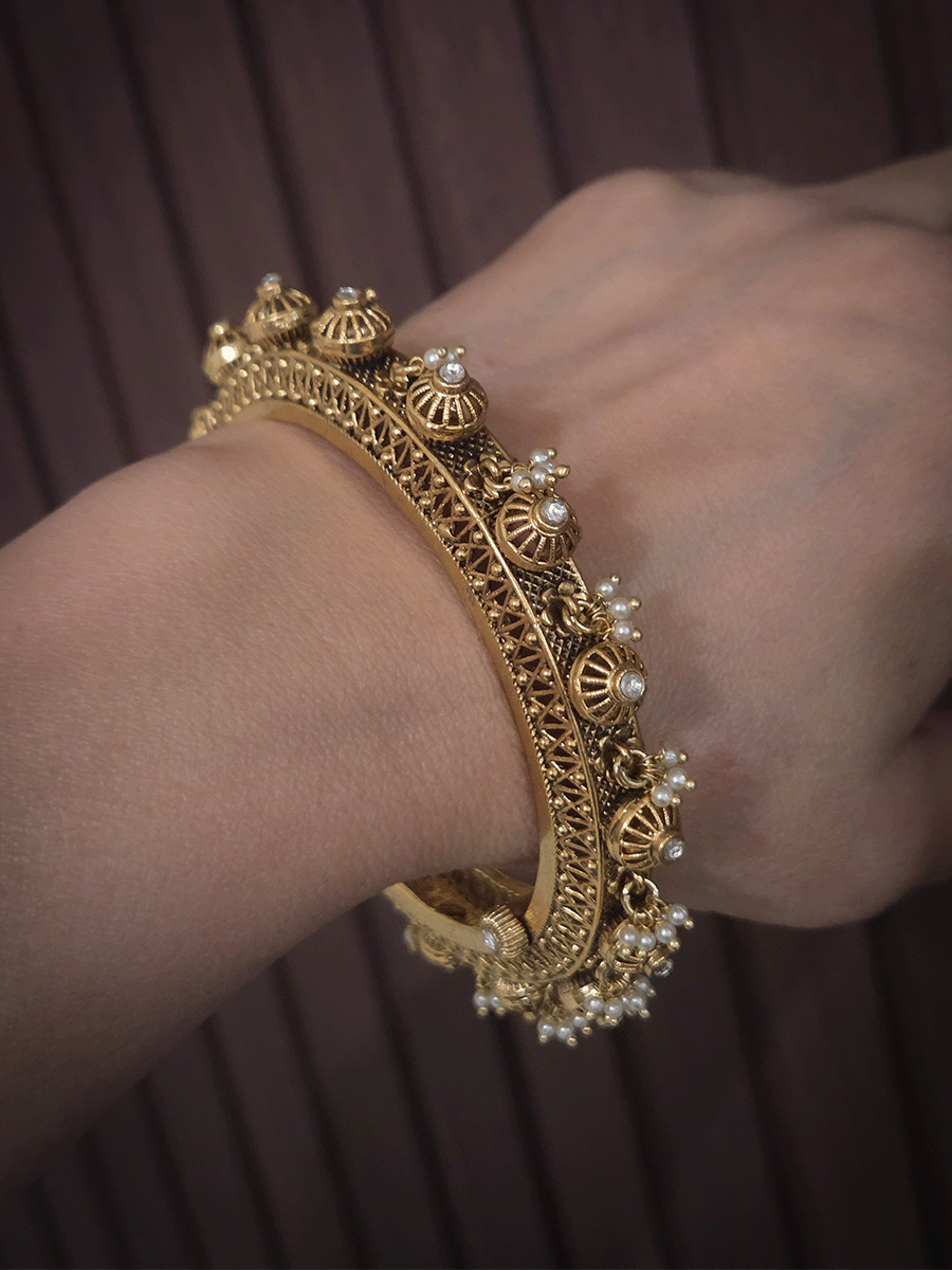 Kundan studded in wheel design set of two openable kada's with pearly hangings