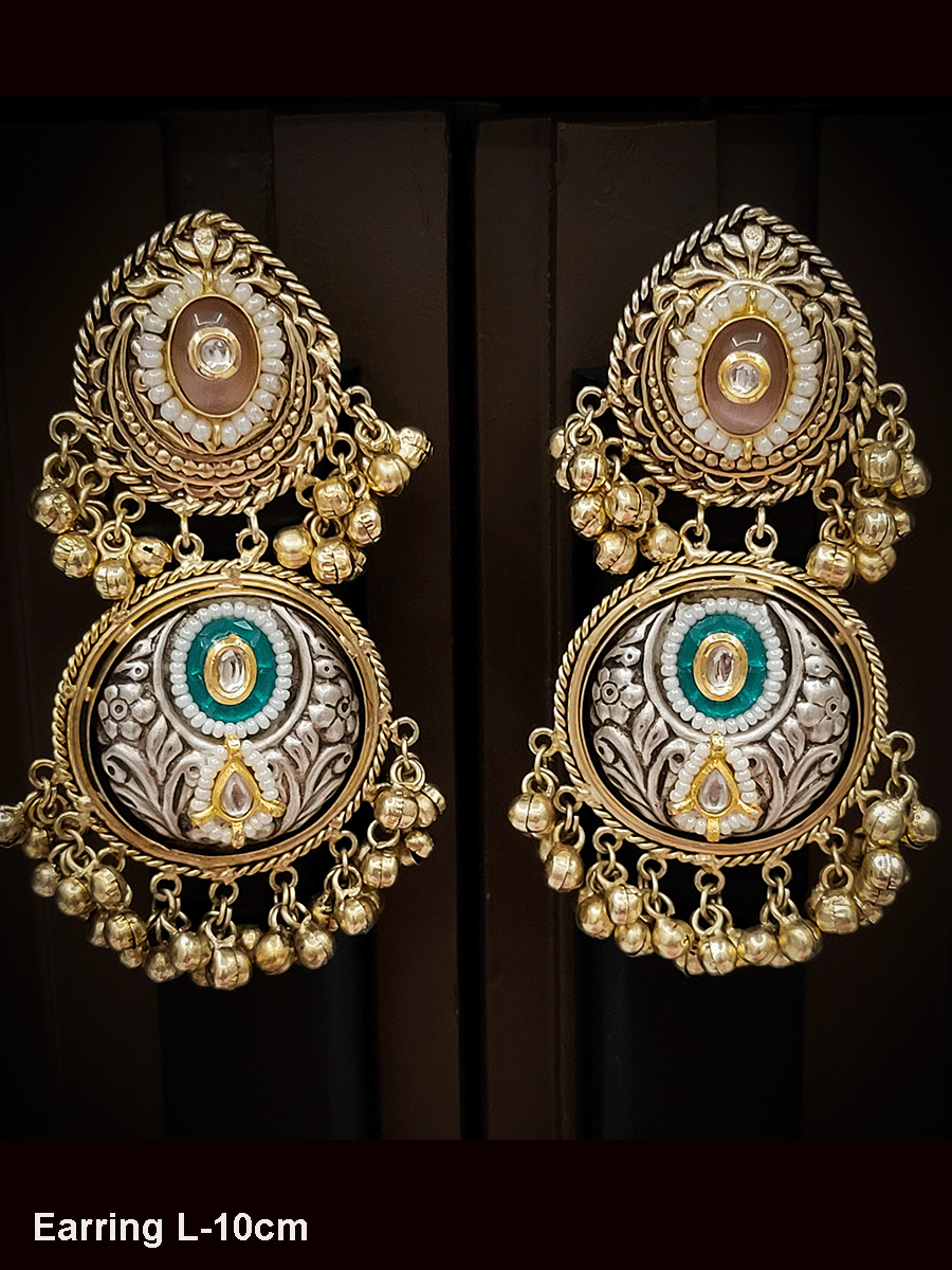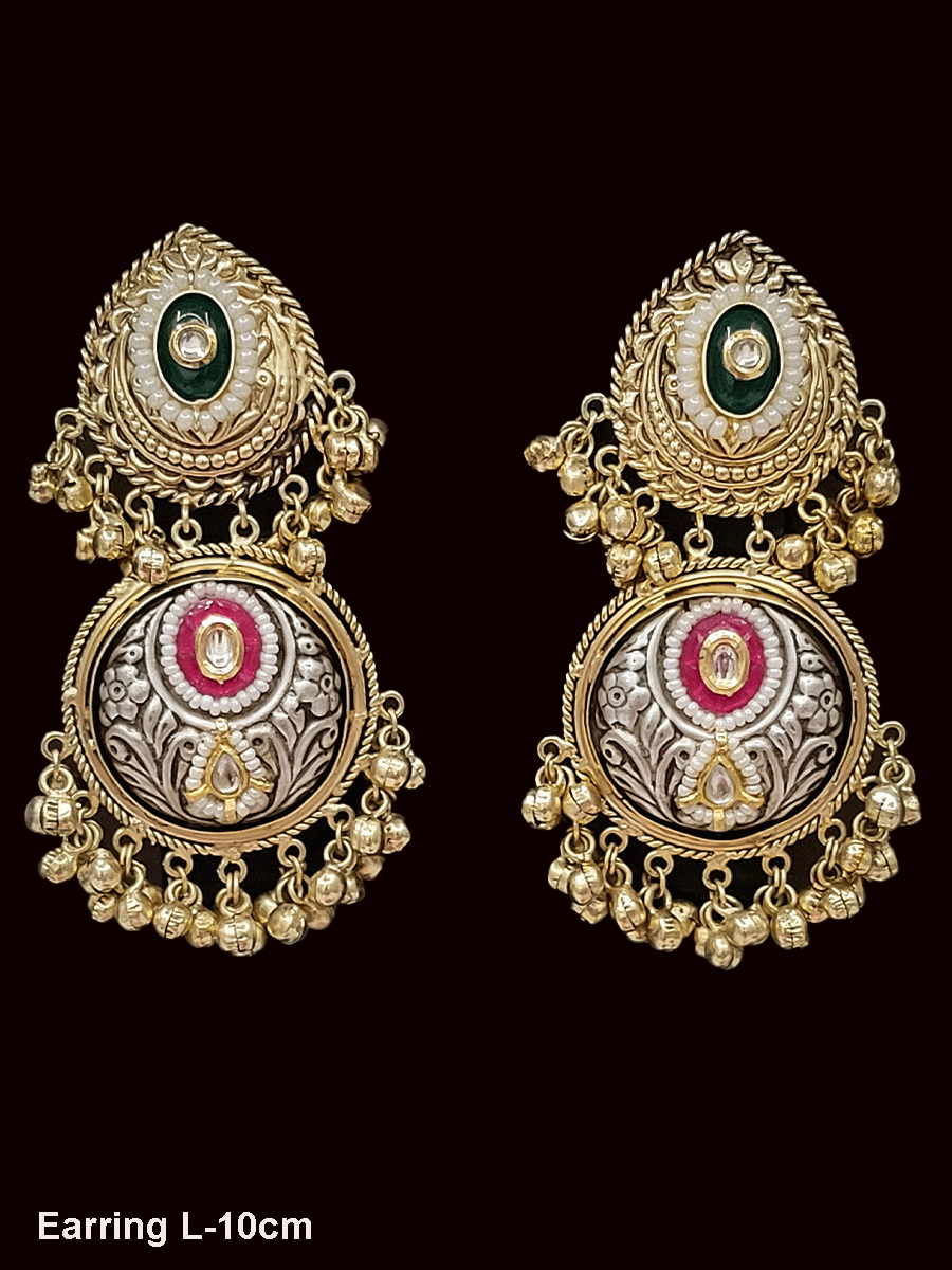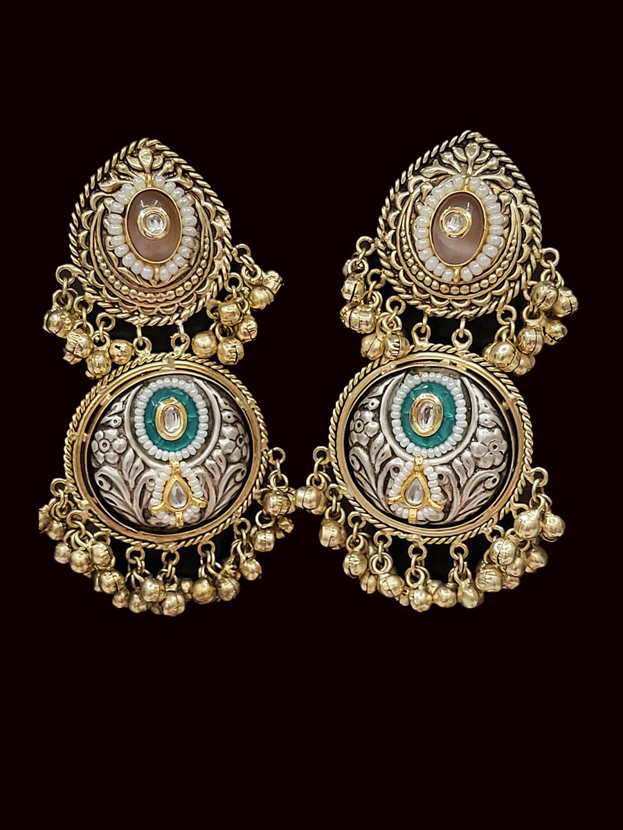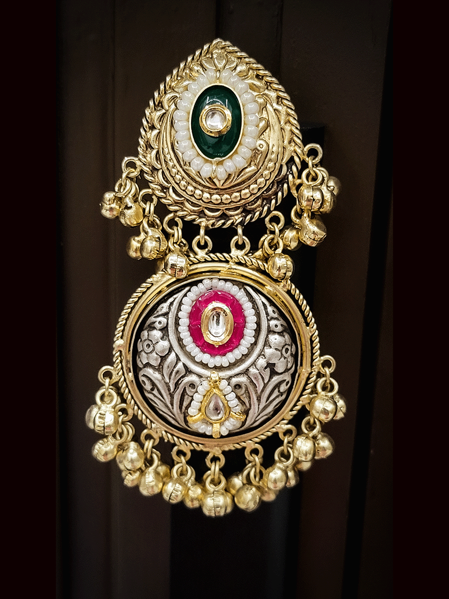 Leaf shaped top with kundan on stone dual finish ghunghru hanging earring(L-10cm)