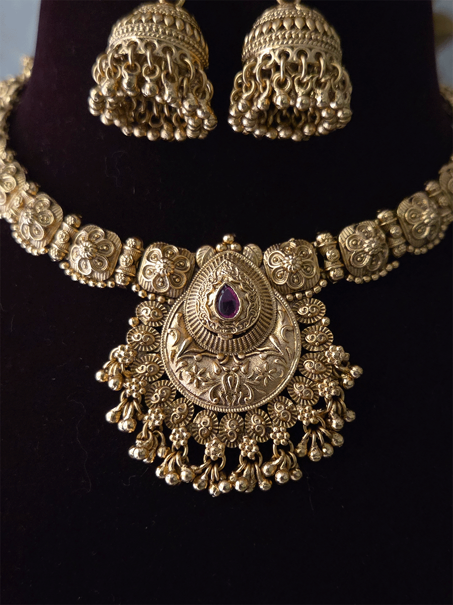 Elegant tear drop stone centerpiece adorned with traditional ghunghru hangings that create a melodious charm. Delicate flower design embellishments frame the sides, connected by graceful strings that enhance the overall aesthetic. Perfect for adding a touch of ethnic sophistication to any occasion, this piece combines classic craftsmanship with contemporary styling. Ideal for festivals, celebrations, or everyday wear for those who appreciate traditional jewelry artistry.