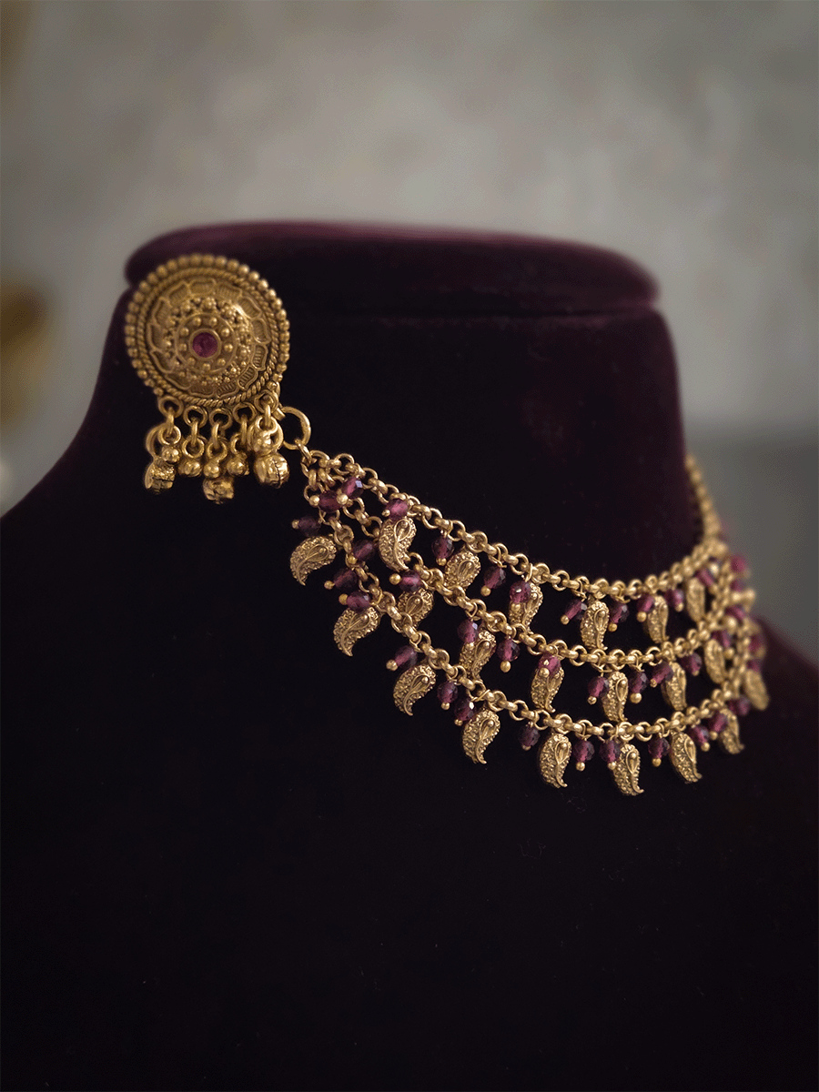 Delicate three-layer ear chains featuring intricately crafted leaf motifs adorned with precisely placed beads. Each layer flows gracefully from the ear, creating dimensional movement and visual depth. The combination of botanical elements and spherical accents reflects traditional Indian jewellery craftsmanship, offering a sophisticated accessory that transitions seamlessly from everyday wear to special occasions. Handmade with meticulous attention to detail, these ear chains embody timeless elegance and refined artistry.