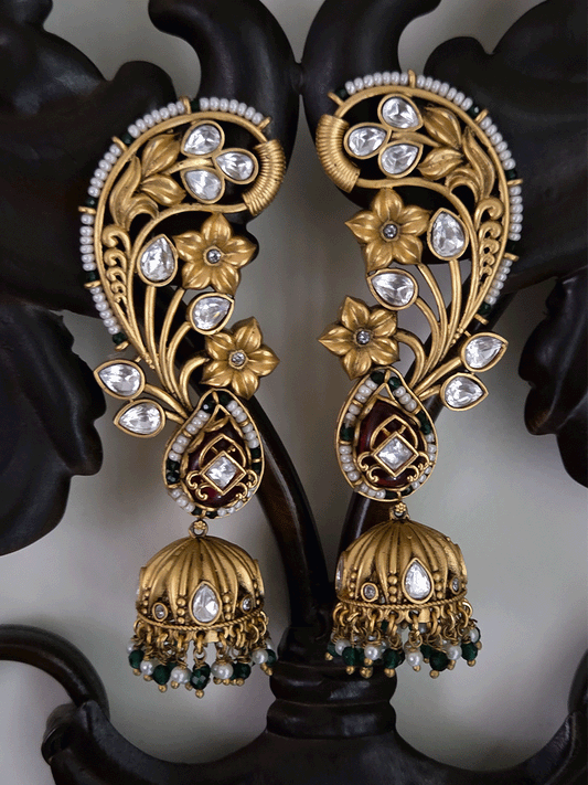 Flower design pirohi work with kundan leaf 4cm jhoomki hanging earcuffs