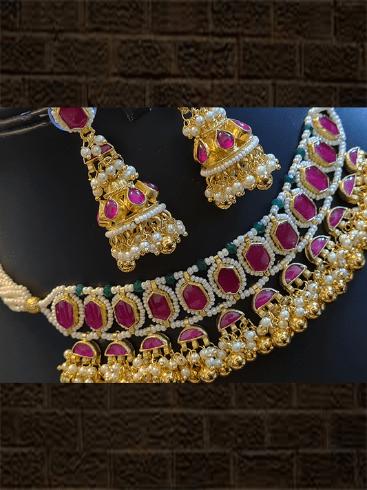 झूमकियों के साथ घुंघरू लेस के साथ गोल्ड प्लेटेड लाल गद्दी कुंदन सेट