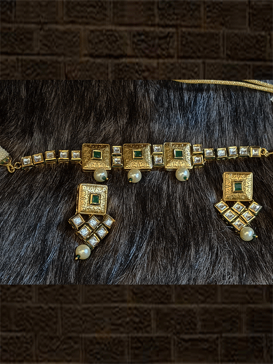 स्क्वायर गोल्डन टुकडीज स्टोन्स जड़ित और पर्ल ड्रॉप कुंदन सेट के साथ