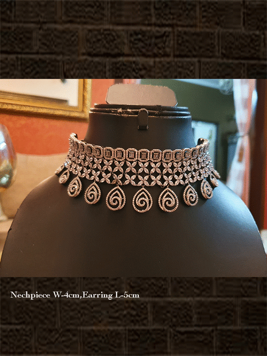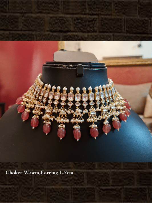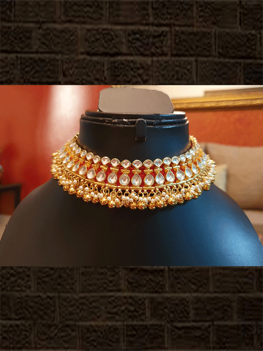 तीन कुंदन फूलों की टुकड़ियों के साथ पिरोही वर्क वाला चोकर सेट