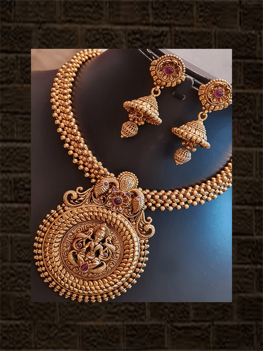 लक्ष्मीजी मोटिफ बोल्ड पेंडेंट सेट बुने हुए गोल्ड बीडेड स्ट्रिंग के साथ