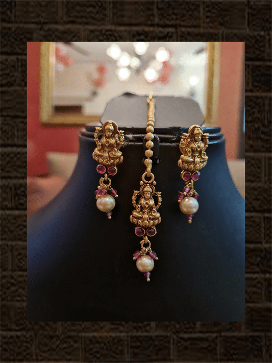 लक्ष्मीजी ने एक तरफ माणिक पत्थरों और दूसरी तरफ मोती के लटके हुए चौड़े सेट को डिजाइन किया