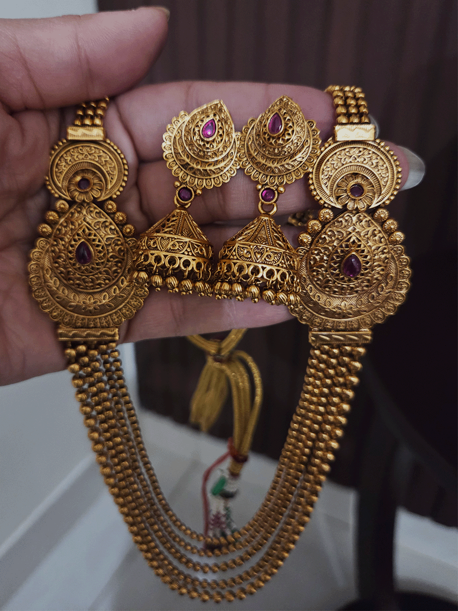 Leaf shaped side brooches with flower and moon top design long set with five gold bead strings