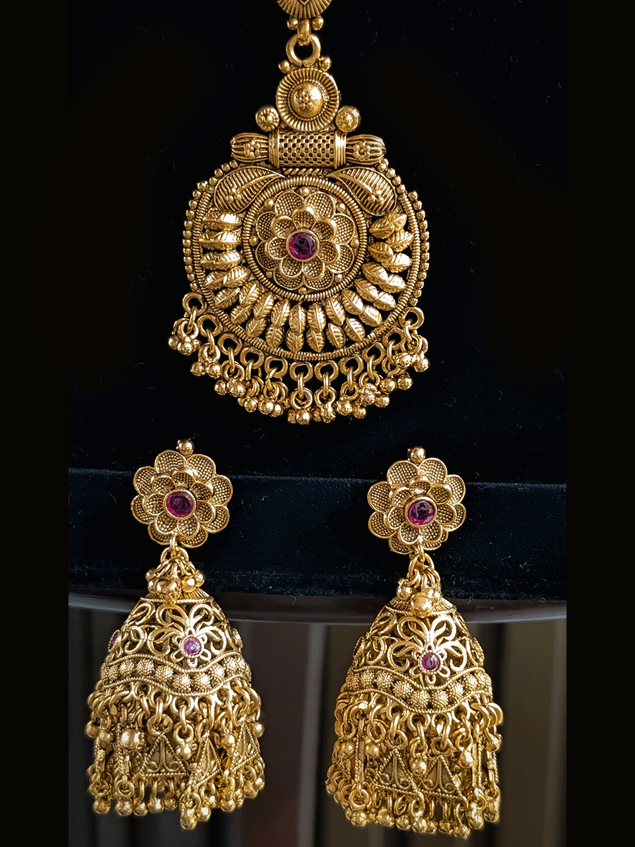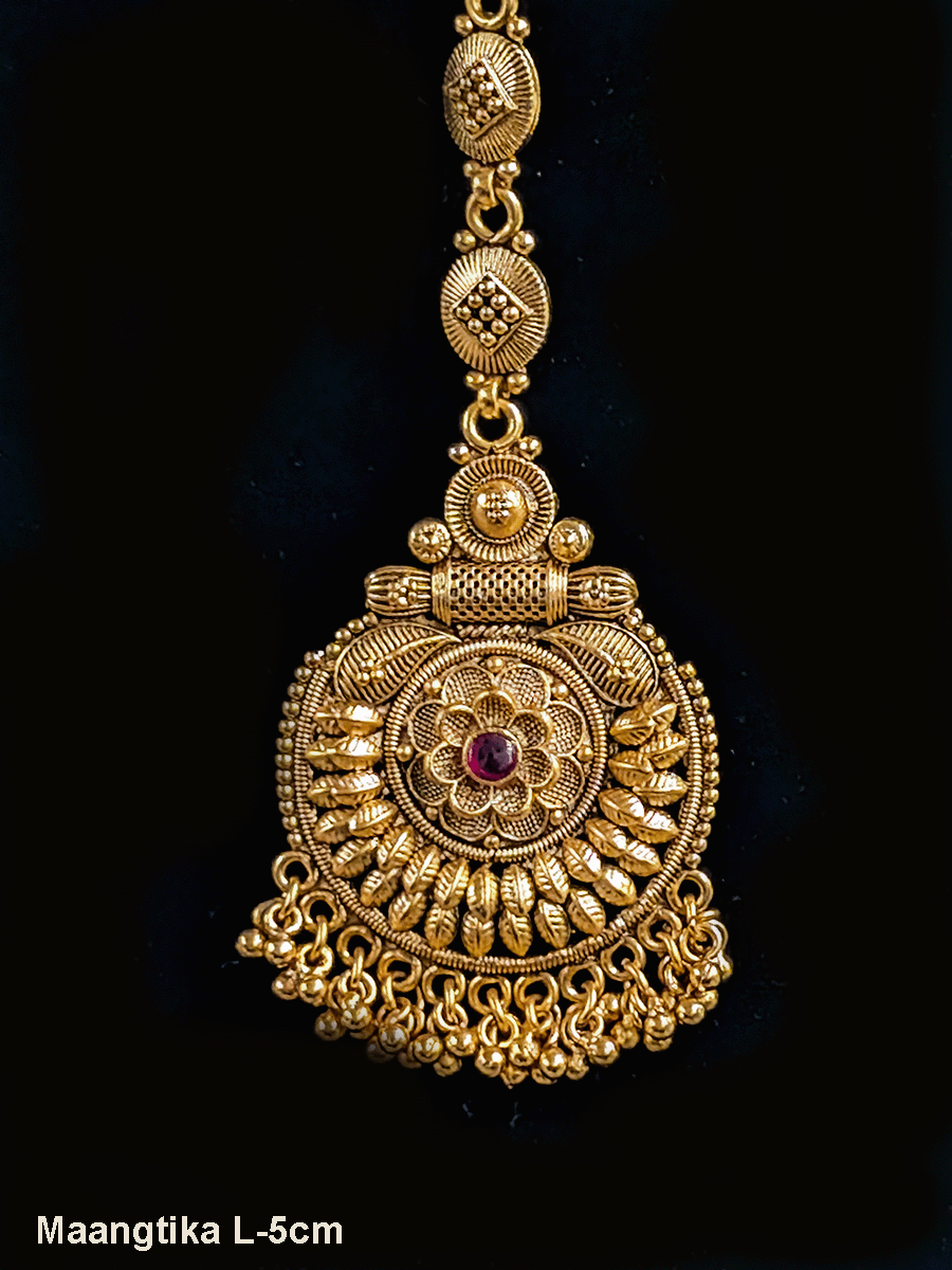 This exquisite Rajputi choker set features an elegant fusion of oval and leaf motifs, expertly crafted to highlight traditional artistry. The centerpiece showcases a delicate flower resting on a finely detailed mesh design, adding depth and sophistication. Perfect for special occasions, this choker enhances your regal look with its intricate patterns and timeless appeal.