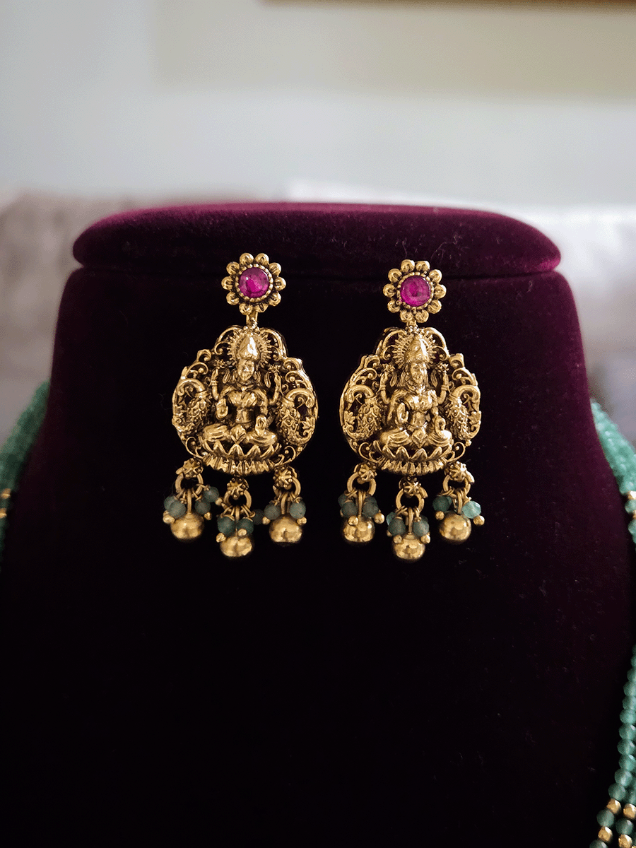 10 inch long aqua bead strings reversible pendant set (Laxmiji on one side and ruby stones design on other)