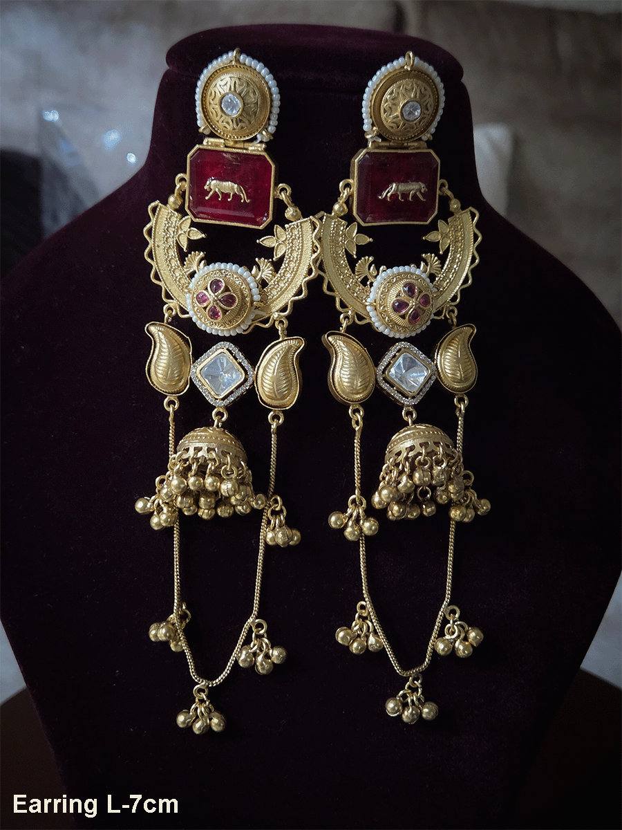 Elevate your ethnic ensemble with these striking 17cm rectangular stone earrings, meticulously crafted to capture traditional artistry. Featuring an intricate paisley design paired with a decorative jhoomki center, these pieces showcase authentic craftsmanship. Delicate chain tassels cascade gracefully from the base, adding movement and dimension to every wear. The substantial length and stone detailing make them ideal for special occasions, festivals, or anyone seeking statement jewelry with cultural significance. A versatile addition to your collection that bridges classic elegance with contemporary style.