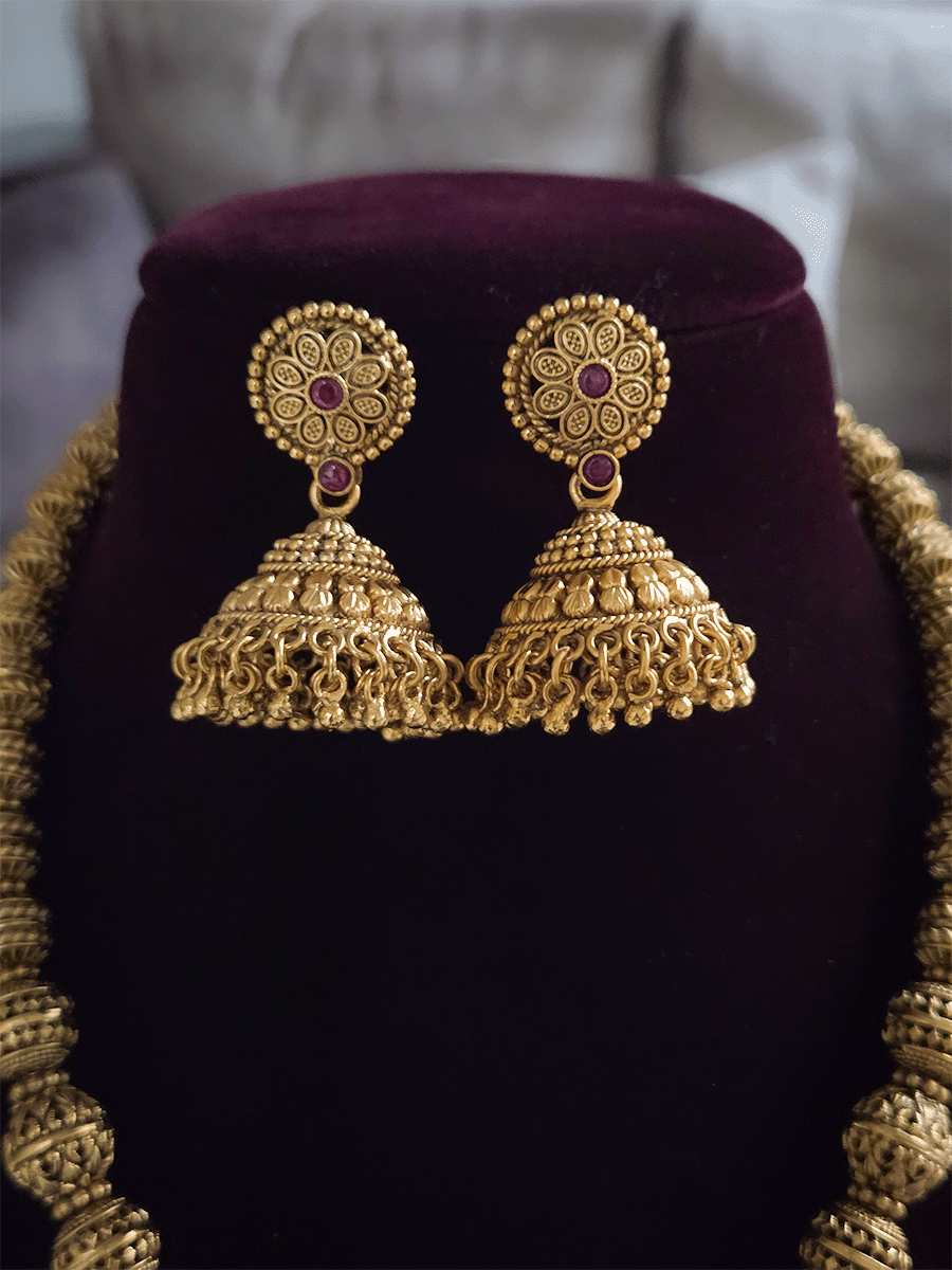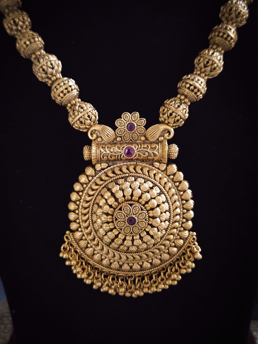 Elevate your traditional jewelry collection with this exquisite 9-inch Matar bead string, meticulously crafted with a captivating flower center design. The piece features a striking ruby stone pendant that serves as the focal point, combining classic artisanal techniques with timeless elegance. The delicate matar beads create a refined texture, while the vibrant ruby adds depth and sophistication. Perfect for festive occasions, cultural celebrations, or everyday wear, this pendant set seamlessly blends heritage craftsmanship with contemporary styling. An investment piece that celebrates authentic jewelry artistry.