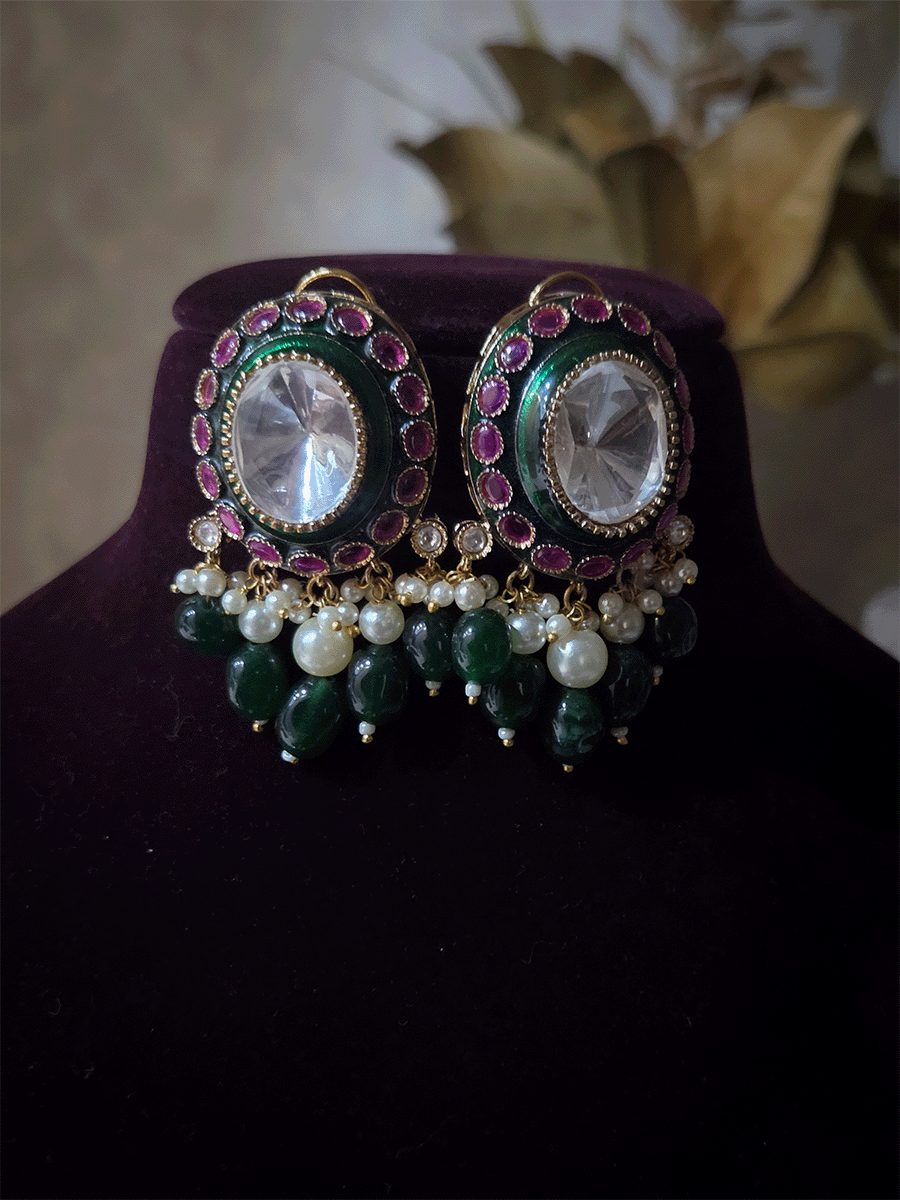 A striking choker that celebrates raw elegance. Uncut polki in a bold oval cut anchors the center, surrounded by vibrant green enamel work that catches light with every movement. Delicate green beads cascade from the base, adding graceful dimension and traditional charm. Perfect for festivals, weddings, or moments when you want your jewelry to make a statement. Handcrafted with attention to detail, this piece blends the timeless appeal of polki with contemporary design sensibility.
