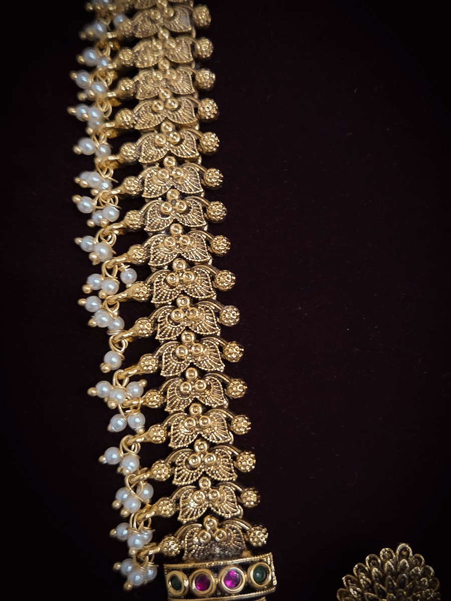 This broad chain features a striking long elephant motif pendant, delicately set against a backdrop of aqua beads. Pearly hangings enhance its elegant appeal, offering a blend of traditional charm and contemporary style. Ideal for making a bold statement, this piece complements a variety of outfits while showcasing intricate craftsmanship.