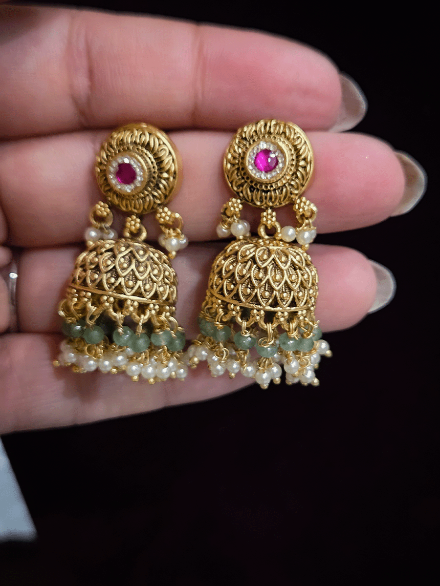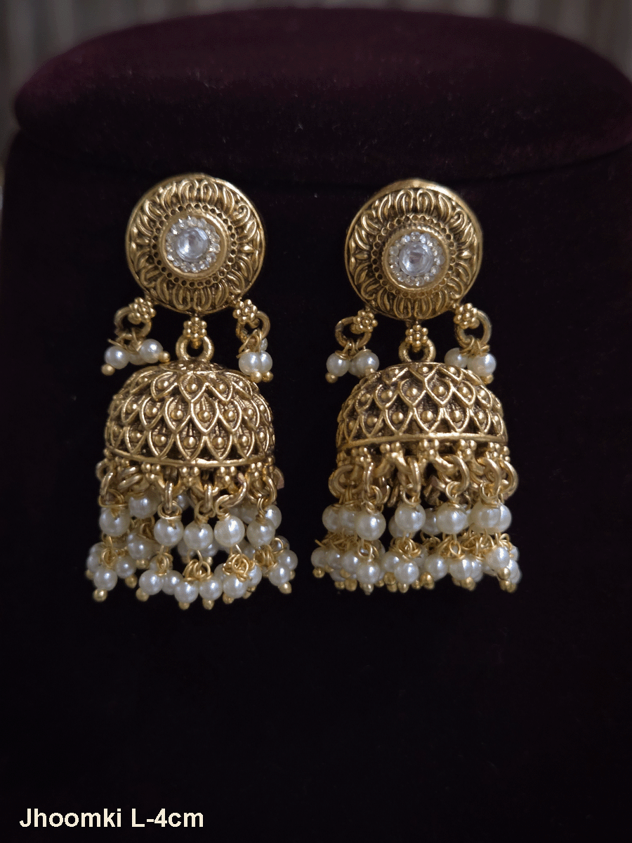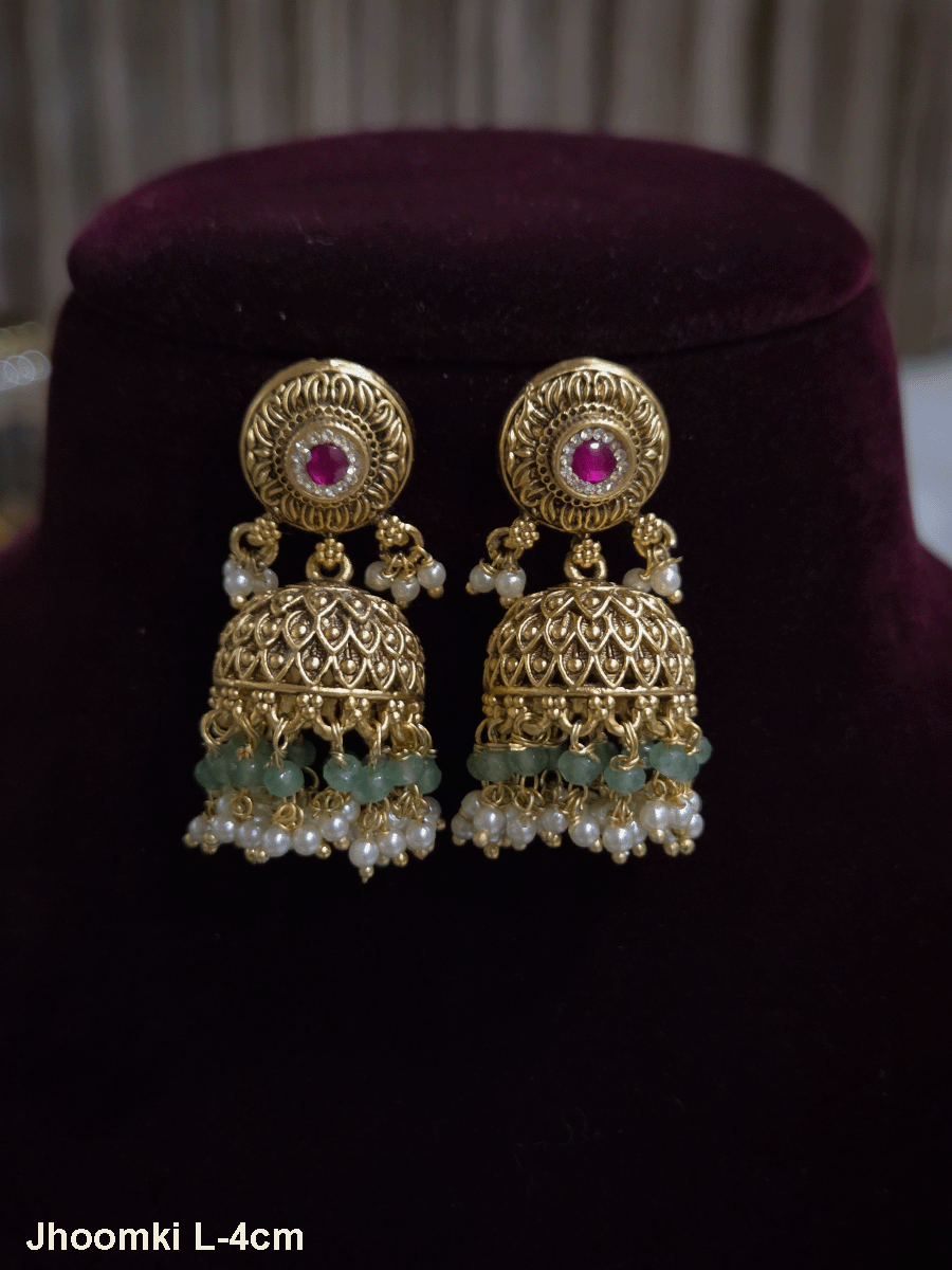 Elevate your ethnic ensemble with these exquisite hanging jhumkis, featuring a circular stone-studded top paired with an intricate center leaf design. The domed bead construction creates dimensional movement, while the 4cm drop length offers balanced proportions for everyday wear and special occasions alike. Crafted with attention to traditional aesthetics, these jhumkis combine ornamental sophistication with comfortable wearability, making them an essential addition to your jewellery collection.