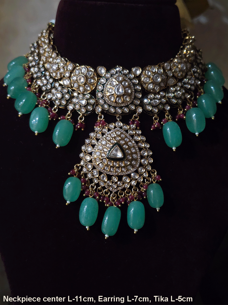 Leaf shaped kundan studded center with green enamel and bold center pendant set