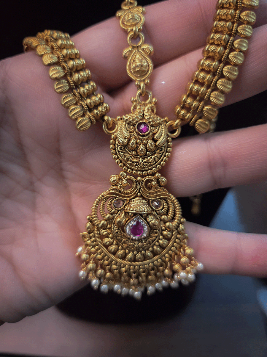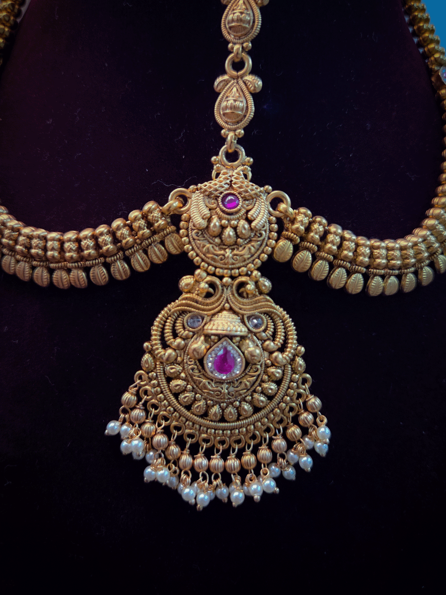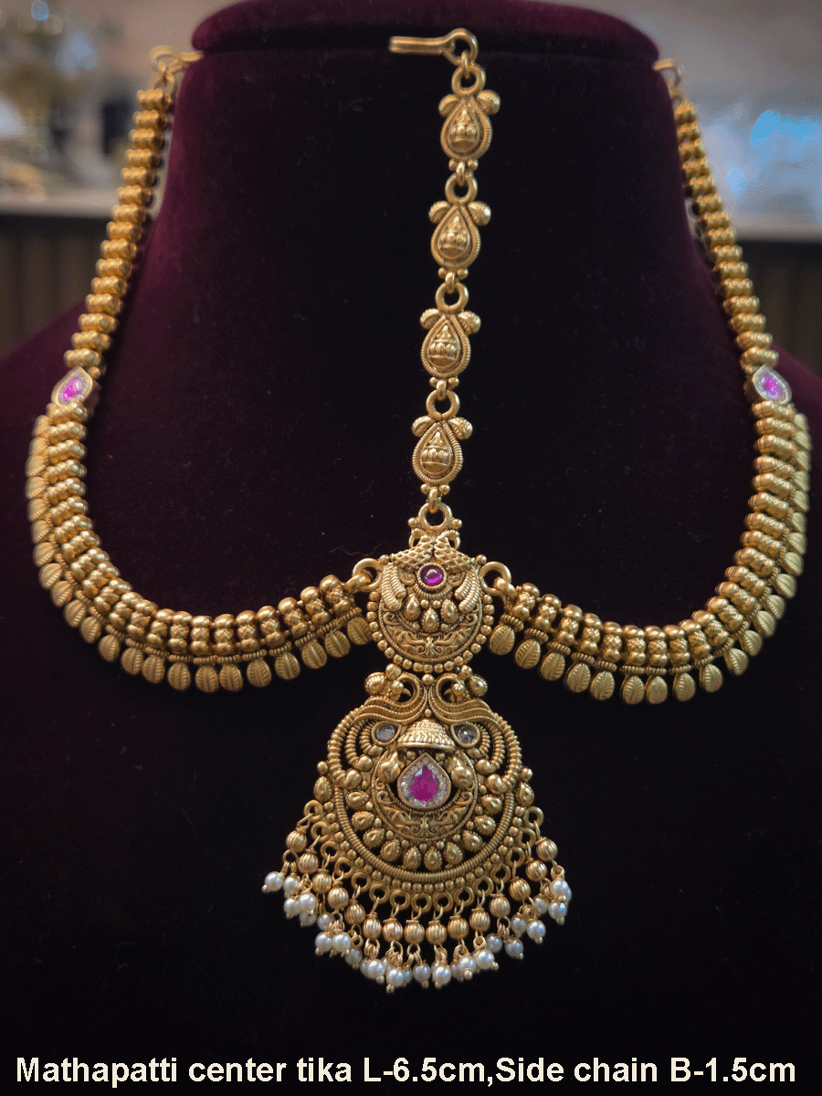 Elevate your bridal ensemble with this exquisite tika mathapatti, a timeless centerpiece of traditional Indian jewelry. The design features a stunning peacock motif adorned with lustrous polki stones and a rich ruby gemstone at the center, creating a captivating focal point. Delicate leaf-patterned side chains extend gracefully, adding movement and sophistication to your look. Crafted with meticulous attention to detail, this piece combines classical artistry with refined elegance, making it an ideal choice for weddings, festivals, and special occasions. The harmonious blend of precious stones and intricate metalwork ensures this mathapatti becomes a cherished heirloom.