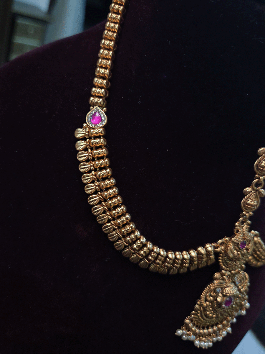 Peacock top with polki and ruby stone center tika mathapatti with leaf design side chains