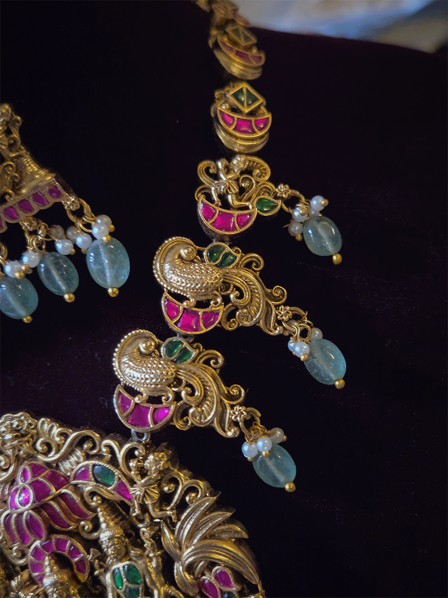 Celebrate divine artistry with this exquisite Ram durbar set, where traditional craftsmanship meets contemporary elegance. Delicate pink and green stones create a harmonious palette across the centerpiece, while peacock-inspired side strings add movement and grace. Aqua bead drops catch light beautifully, completing a jewellery piece that honours both heritage and refined taste. Perfect for festive occasions and spiritual celebrations, this handcrafted set embodies timeless Indian jewellery design.
