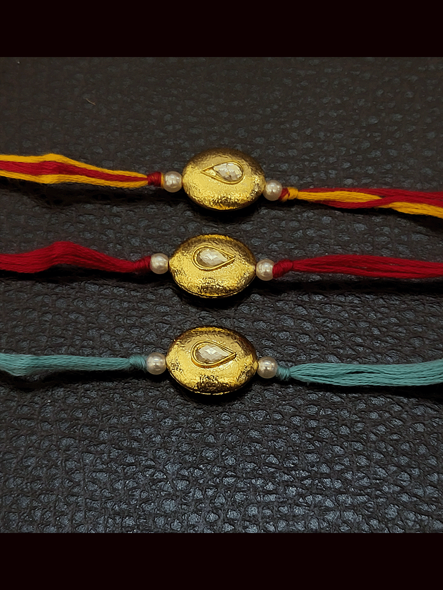 Set of three coloured thread gold bead rakhi's with kundan in the center(Set of 3 rakhi's)