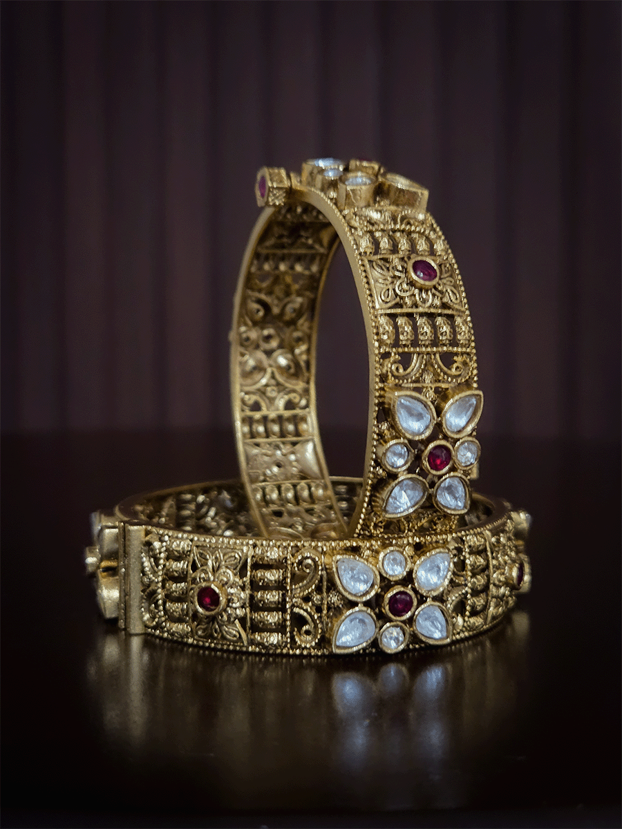 This exquisite set features two openable kundan kadas, crafted with traditional floral motifs and intricate carving. Designed to showcase timeless elegance, these bangles allow easy wear while reflecting skilled artistry. Perfect for adding a classic touch to any ensemble, they blend heritage design with functional sophistication.