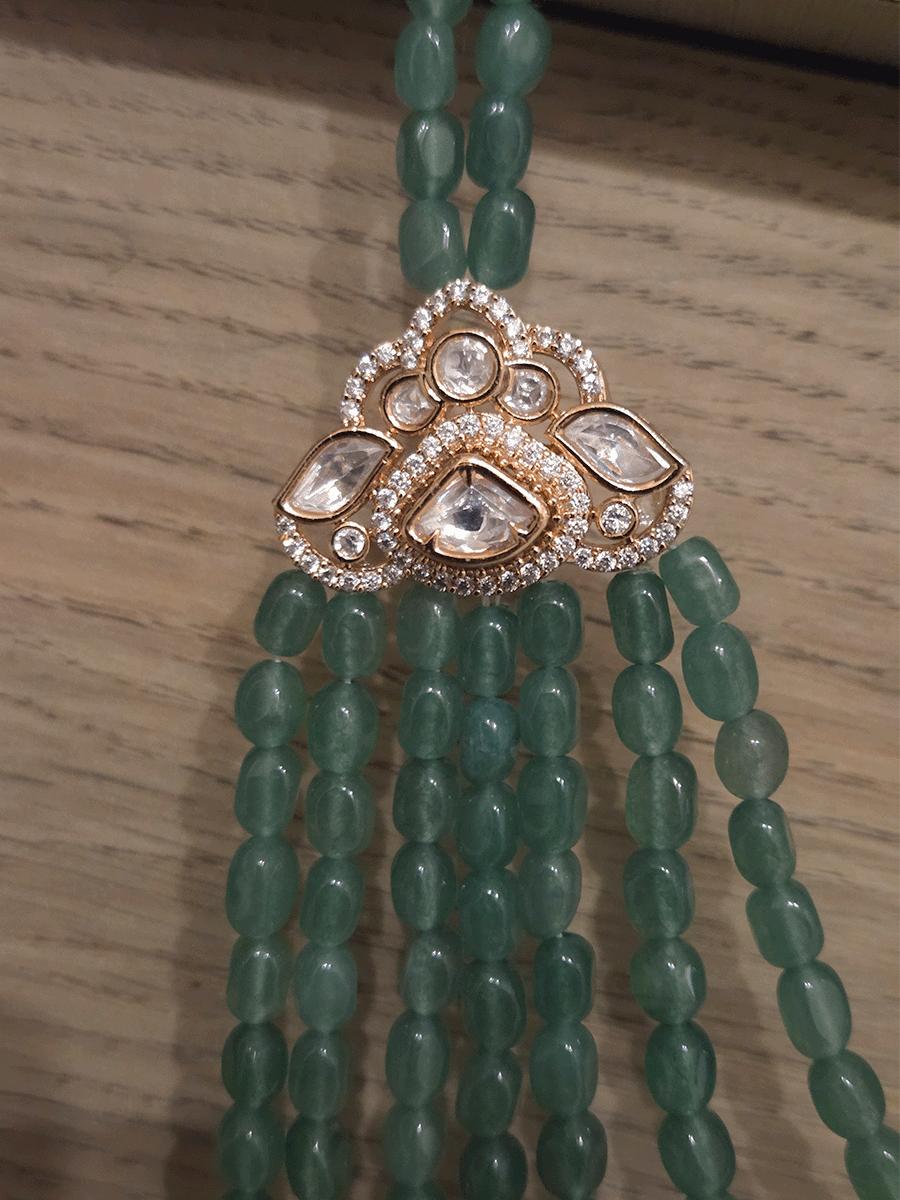 Elevate your traditional ensemble with this exquisite seven-layer leaf design necklace, a masterpiece of contemporary craftsmanship. Centered with brilliant moissanite tukdies that catch light with exceptional sparkle, this 17-inch piece combines timeless leaf motifs with modern gemstone brilliance. Complemented by triangular side brooches, the design creates a sophisticated layered aesthetic perfect for festive occasions and celebrations. Each element is thoughtfully proportioned to balance elegance with wearability, making this necklace an investment in heirloom-quality jewellery that transcends seasons.