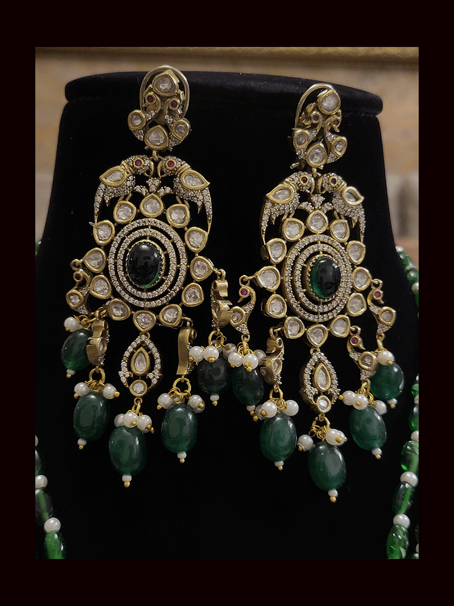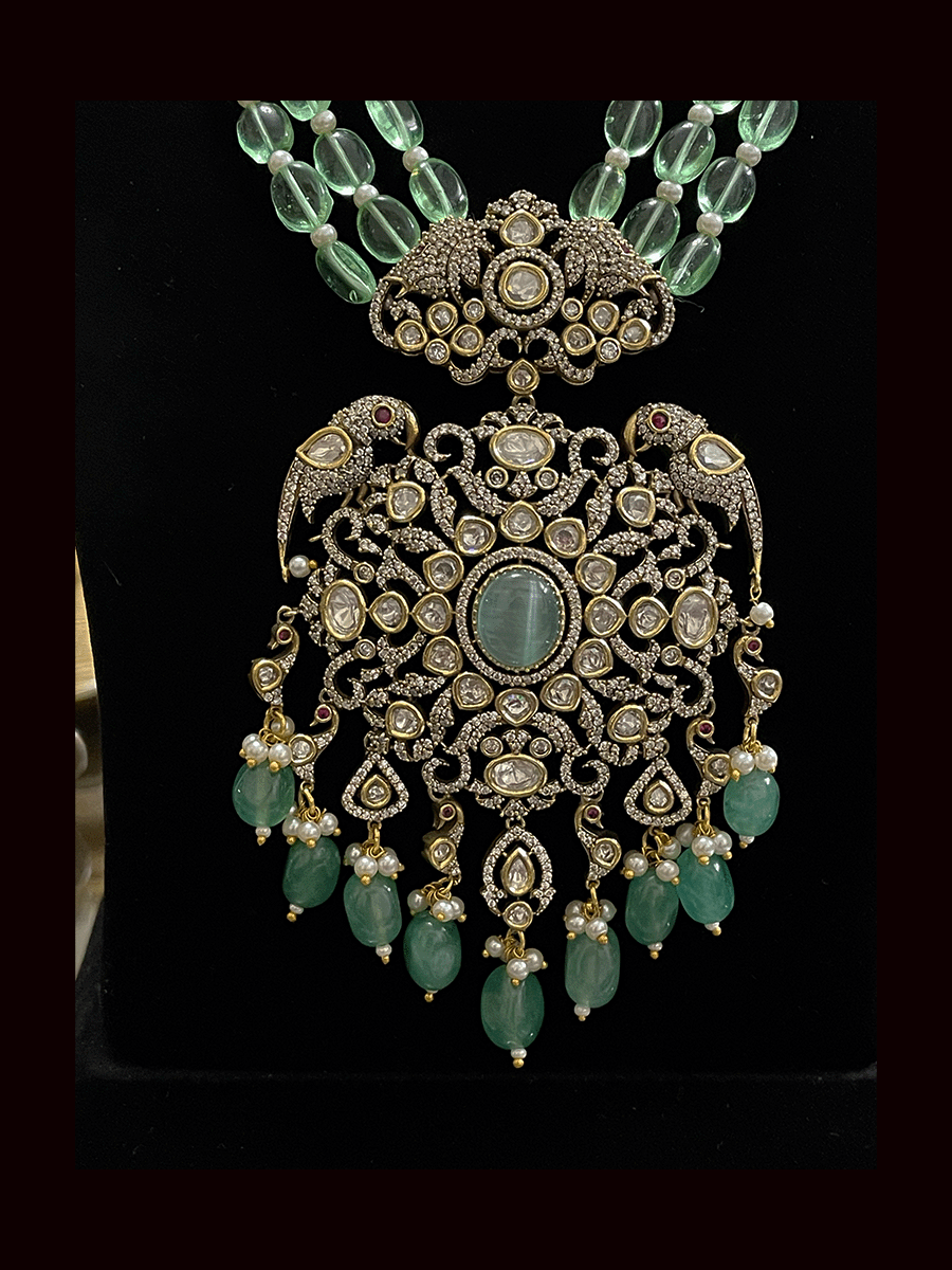 Three beaded 9 inch long strings zircons and kundan studded pendant set with parrot motifs on sides