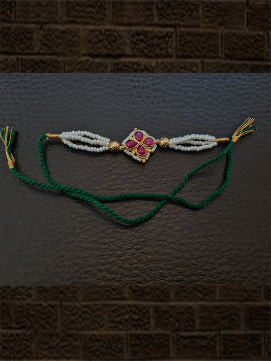 పిరోహి వర్క్తో స్టోన్స్ ఫ్లవర్ మరియు సైడ్ త్రీ చీడ్ స్ట్రింగ్స్ రాఖీ