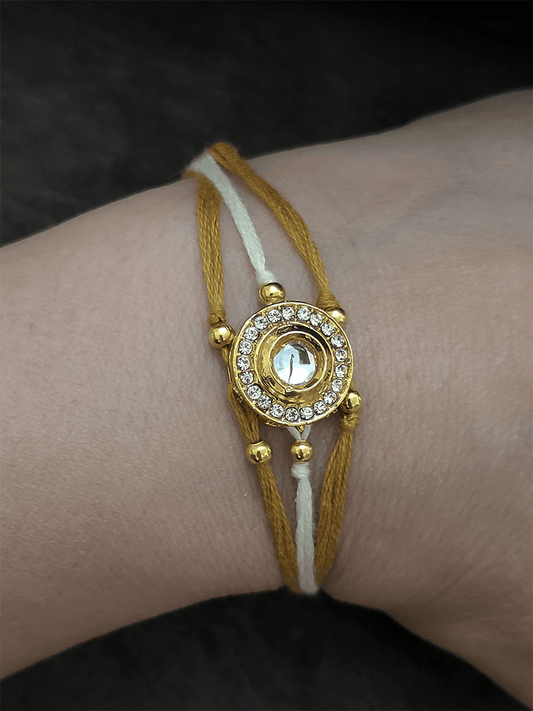 గోధుమ మరియు తెలుపు దారంతో వృత్తాకార కుందన్ మరియు AD రాఖీ