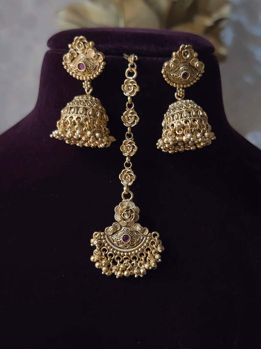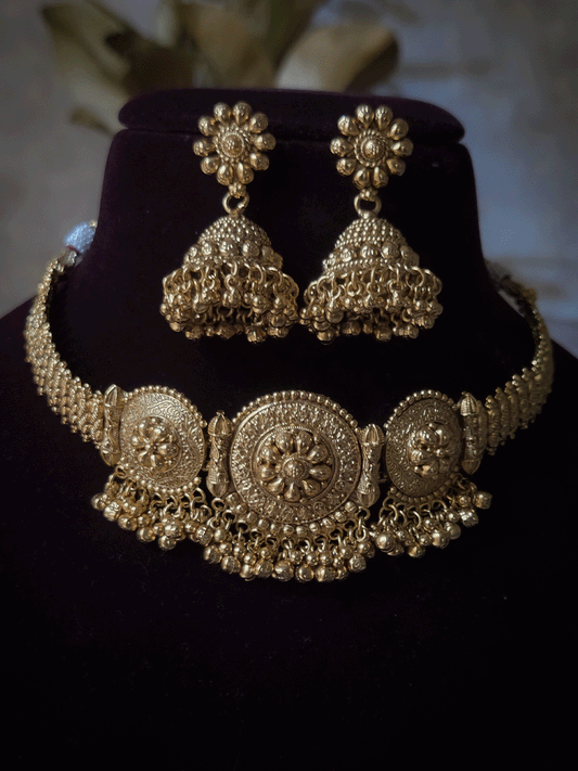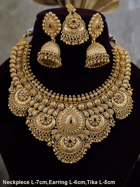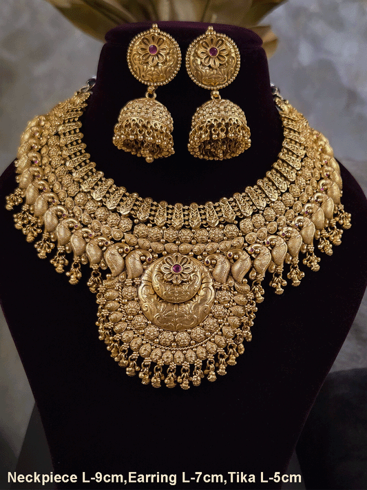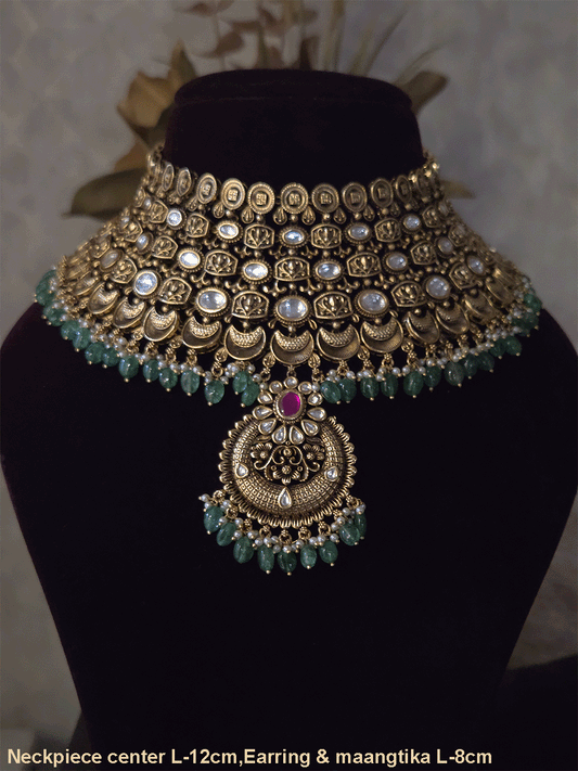 Circular center with side peacock design mesh design triangular hangings rajputi choker(with jhoomkies and maangtika)