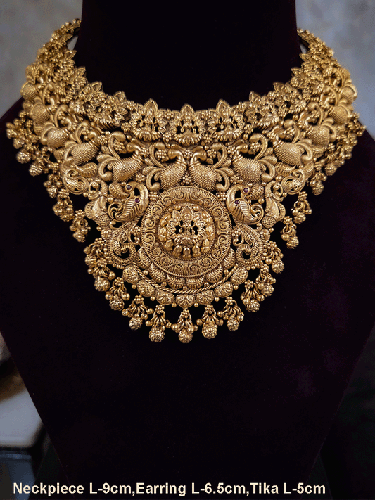 Laxmiji motif in circular design center and on neckline of peacock design broad set with ghunghru hangings