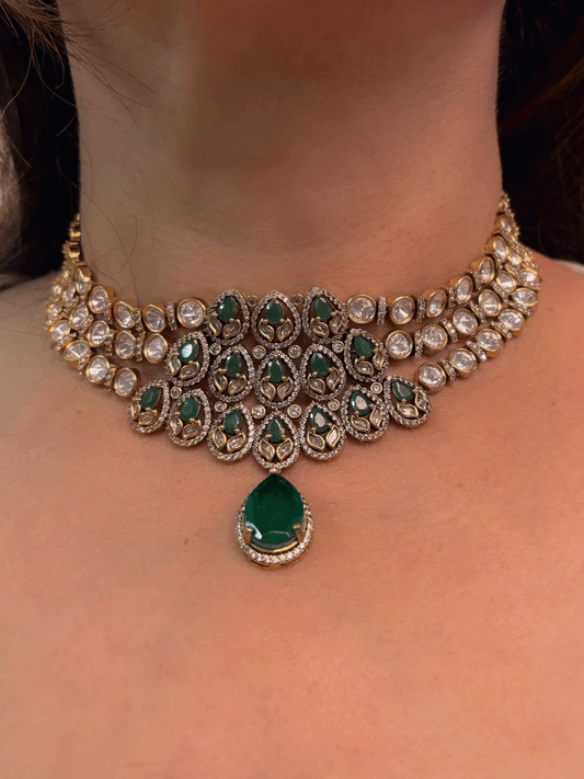 Green stones studded triple layer moissanite set with green tear drop hanging