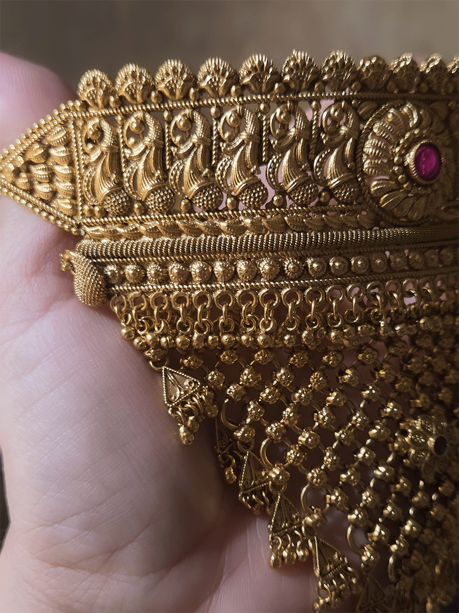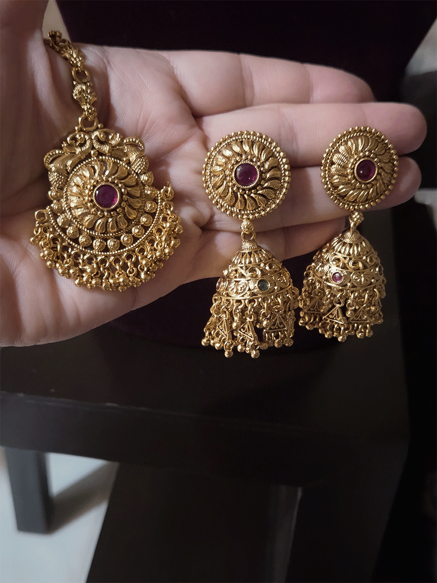 Circular center with side peacock design mesh design triangular hangings rajputi choker(with jhoomkies and maangtika)