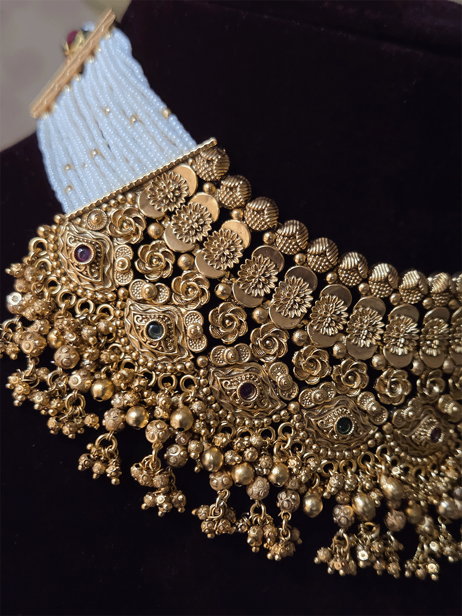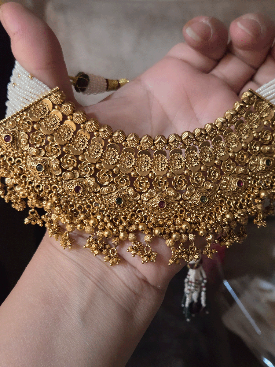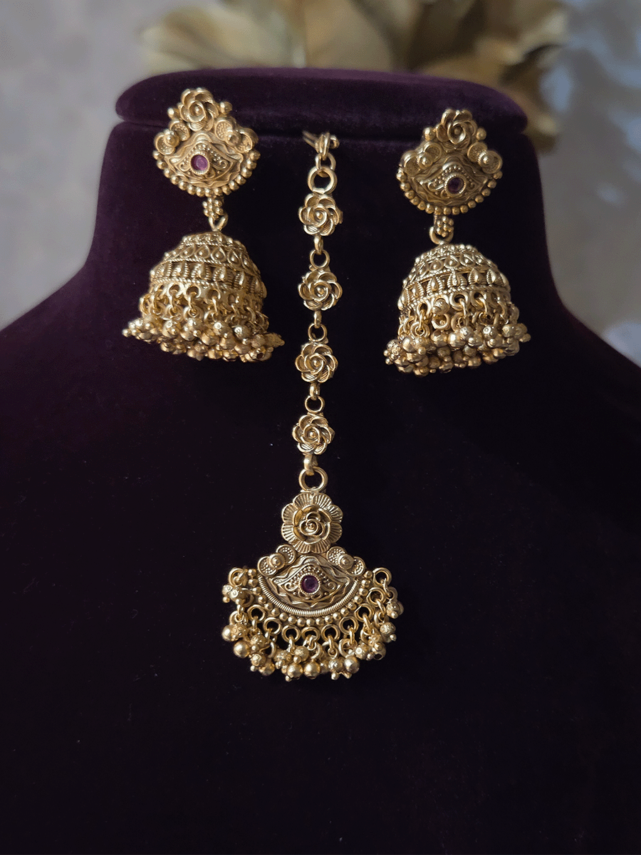 Elevate your traditional look with this exquisite flower-inspired jewelry set, featuring vibrant ruby and emerald-green stones meticulously studded in an intricate design. The piece is complemented by delicate cheed strings on the sides, adding graceful movement and authentic charm. Perfect for weddings, festivals, and special occasions, this set combines timeless craftsmanship with elegant aesthetics. A stunning addition to any jewelry collection that celebrates cultural heritage and refined taste.