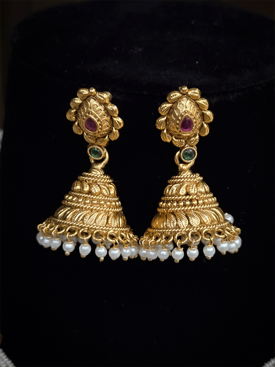This elegant 8-inch long set features a leaf-shaped pendant intricately crafted with a paisley design, paired with a delicately woven cheed string accented by matar beads. The combination offers a refined, traditional aesthetic that enhances any outfit with subtle sophistication. Ideal for those seeking unique craftsmanship and timeless style in their jewelry collection.