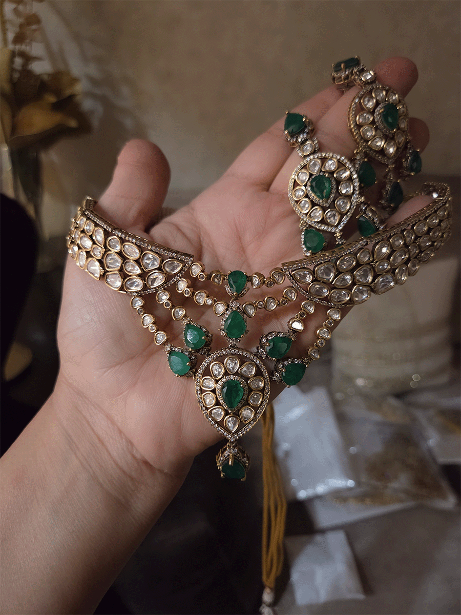 Moissanite set with connecting moissanite tukdies with green tear drop stones set