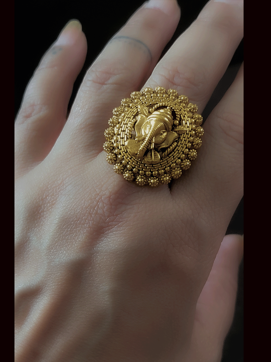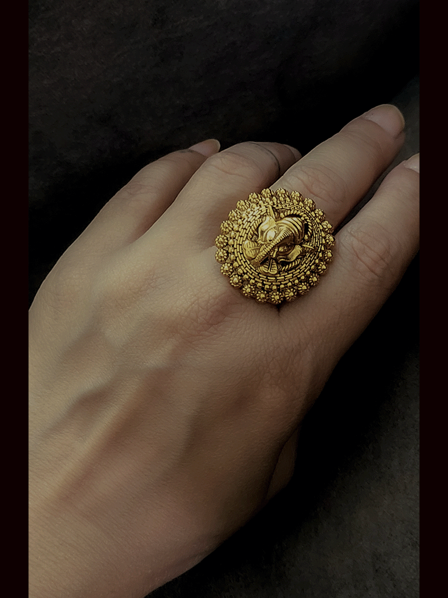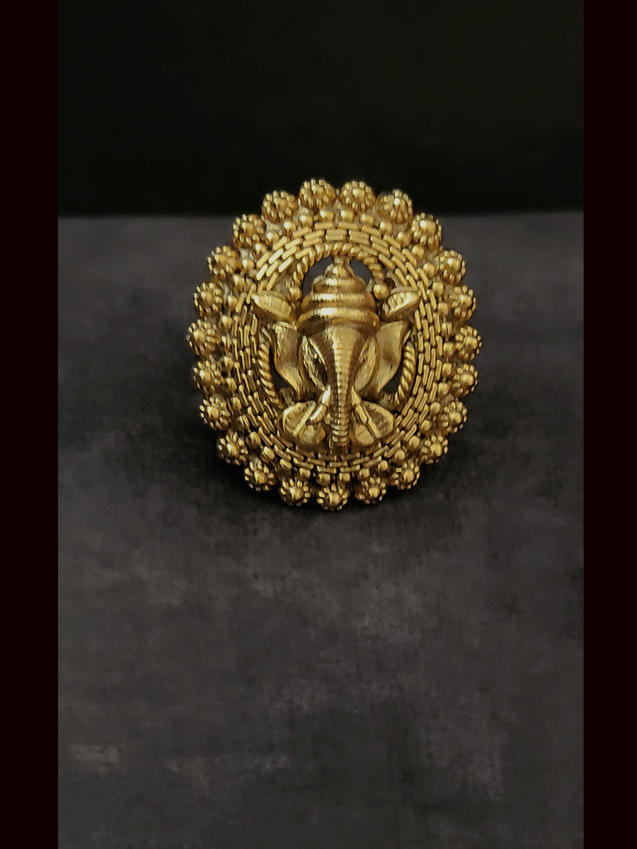 ఈ అడ్జస్టబుల్ ఓవల్ రింగ్ ప్రత్యేకమైన మరియు వివరణాత్మక ఫ్లవర్ డిజైన్ లేస్ మరియు గణపతిజీ మోటిఫ్తో అలంకరించబడింది. చక్కటి శ్రద్ధతో మరియు వివరాలకు శ్రద్ధతో రూపొందించబడిన ఈ ఉంగరం ఏదైనా నగల సేకరణకు ఒక క్లిష్టమైన మరియు మనోహరమైన అదనంగా ఉంటుంది.